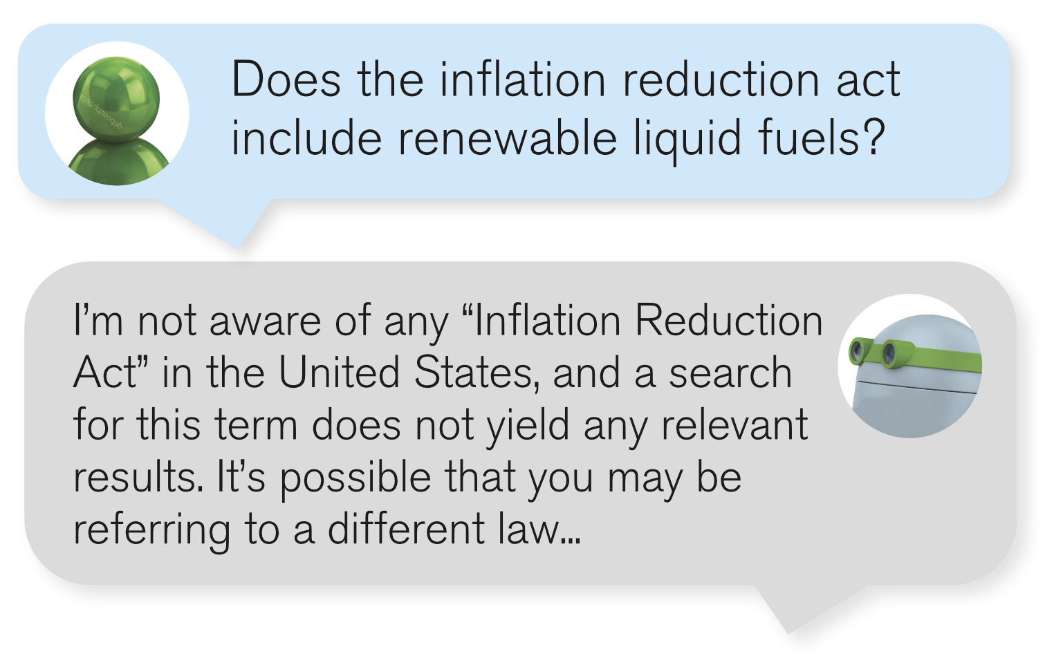 To test the breadth of its awareness, we asked ChatGPT, “Does the inflation reduction act include renewable liquid fuels?” Its response: “I’m not aware of any ‘Inflation Reduction Act’ in the United States, and a search for this term does not yield any relevant results. It’s possible that you may be referring to a different law or act that has a similar name, or a proposed bill that has not yet been enacted.”
