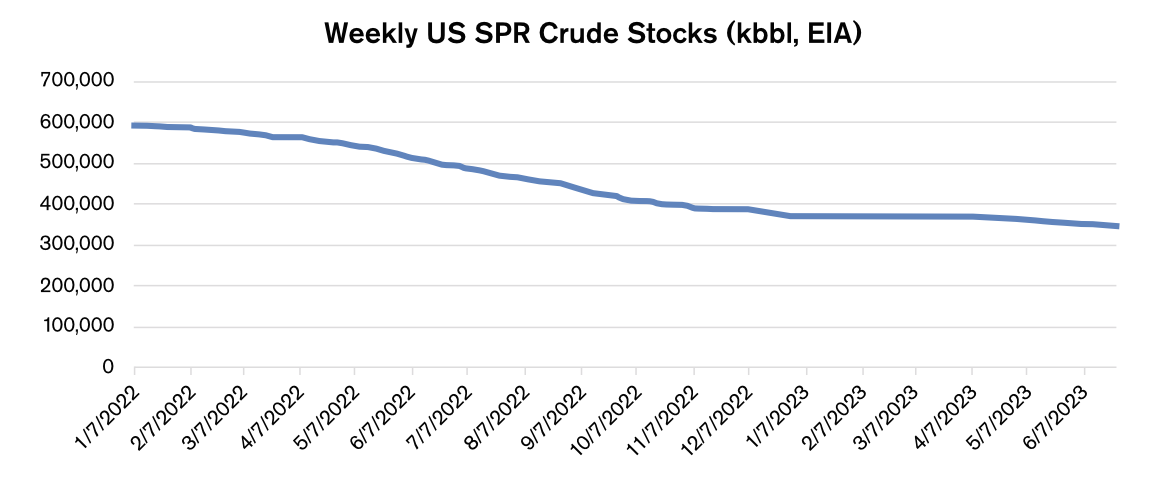 Another factor likely weighing on the market has been the use of the SPR. The White House announced last March that it would be releasing 1mb/d from the reserve for 180 days. Inventory levels in the reserve fell by 148 million barrels (mb) from April through the end of September, and stocks continued to fall throughout the period of the OPEC+ cuts detailed above. SPR stocks fell by an additional 68mb to 349mb by June 23, the lowest level in the weekly data series since 1983.