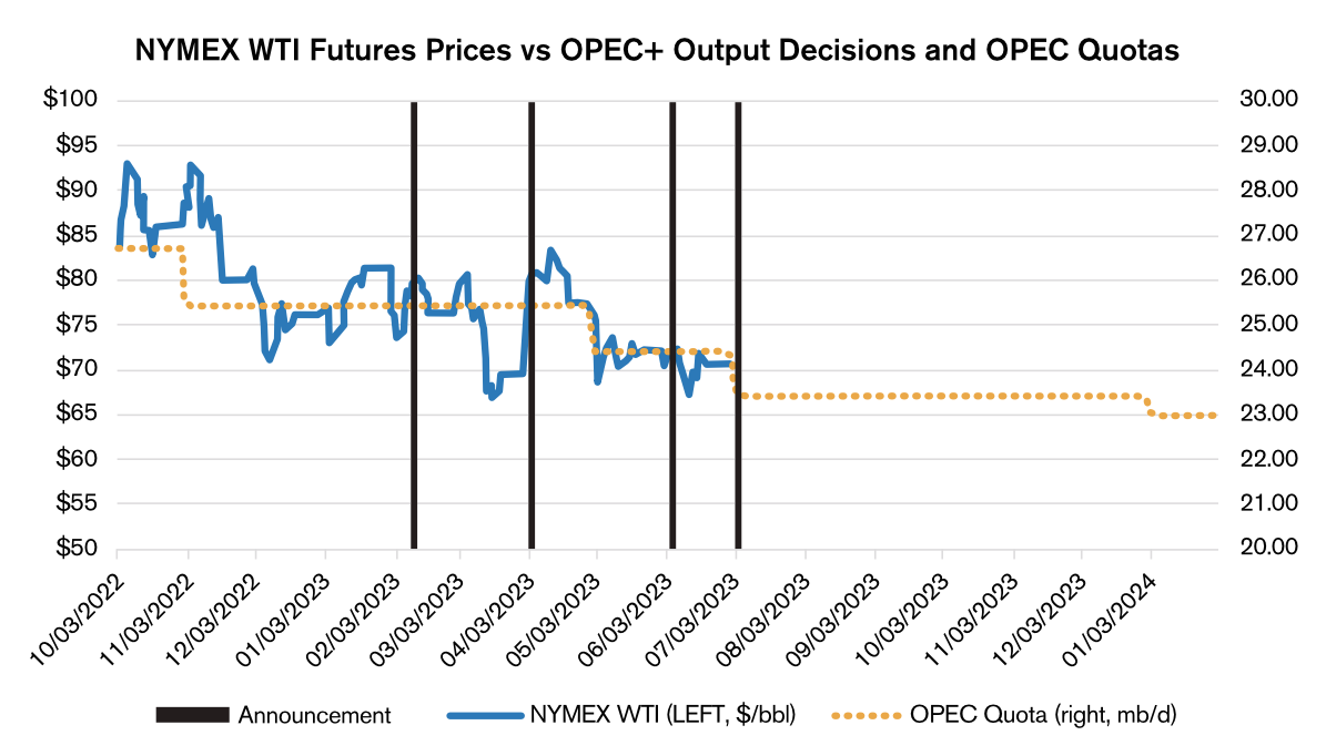 Oil prices this June were a far cry from the sky-high prices we saw one year ago, following the Russian invasion of Ukraine and the imposition of Western sanctions. From a high of $124 per barrel (bbl) on June 14, 2022, front-month NYMEX WTI crude oil futures prices nearly halved, plunging to as low as $67/bbl on June 12, 2023. This tumble came despite a series of actions by OPEC+ countries to support the market. What were these steps and their impact, why were they not more impactful, and what is the outlook ahead?