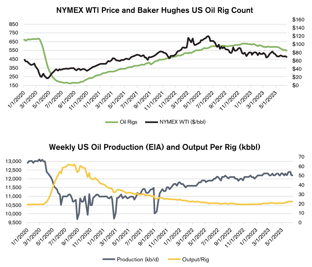 From October of last year through June 23, U.S. oil production increased by just 0.2mb/d, even as WTI prices averaged $83 in Q4, $76 in Q1, and $73in Q2. Only the latest data point as of this writing (12.4mb/d as of the June 30 week) indicated more robust production growth – and this was still far from the 13.10mb/d pre-pandemic high. Meanwhile, the U.S. oil rig count fell along with crude prices – from 602 in early October to just 540 by early July – a 10% drop. Increased efficiency (output per rig) has helped keep production steady or rising slightly, depending on the week, despite the falling rig count. It is likely that a combination of the factors we have discussed above are leading to hesitancy in drilling investment decisions: fears over the global economy and therefore demand, a higher cost of capital due to strong interest rates, high inflation pushing up costs and dampening prospects for profitability, and a “twice-shy” reticence to over-invest after the pandemic price plunge that left shareholders up in arms.